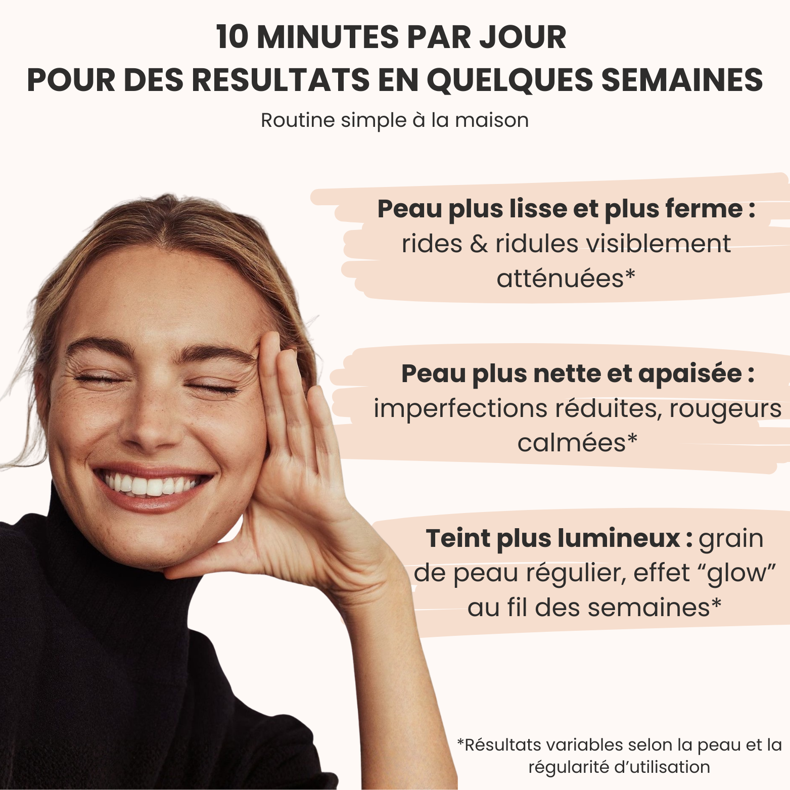 Les premiers effets peuvent apparaître dès 1 mois ou 2 d’utilisation régulière suivant votre type de peau, avec une amélioration progressive au fil du temps.