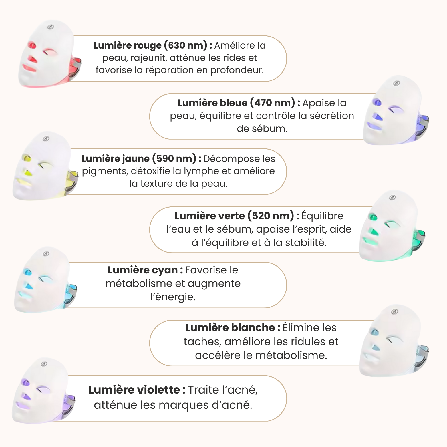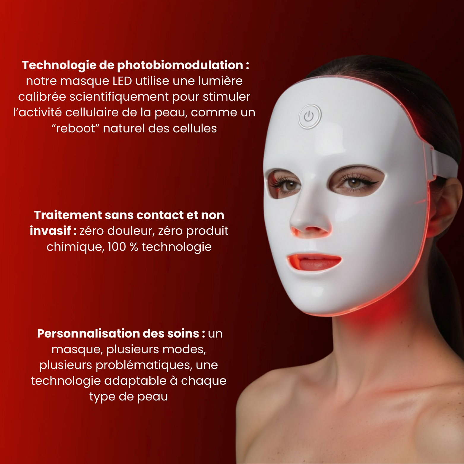 Un masque LED utilise des lumières à différentes longueurs d’onde (rouge, bleu, infrarouge) pour stimuler la peau, améliorer la circulation sanguine, réduire les rides et traiter les imperfections.